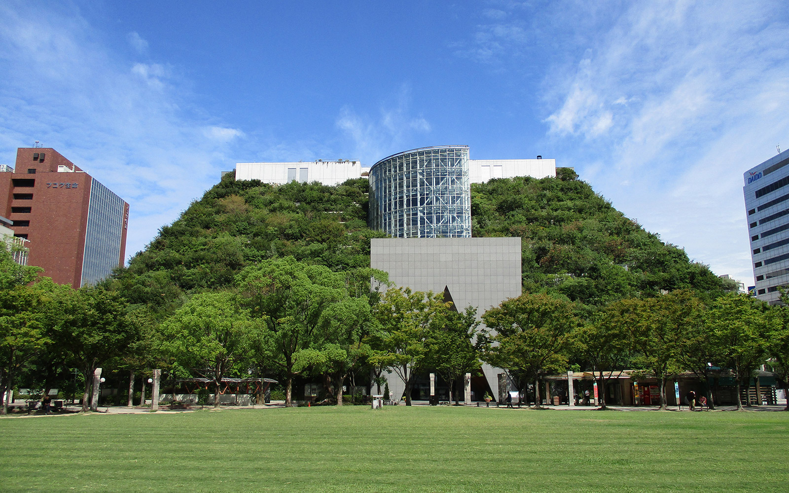 階段状の斜面に緑があふれ、滝が流れる屋上庭園。まるで自然の山のようで「アクロス山」とも呼ばれています。訪れる人々に潤いと安らぎを与える都会の中のオアシス、都市と水と緑が共存する心休まる空間です。